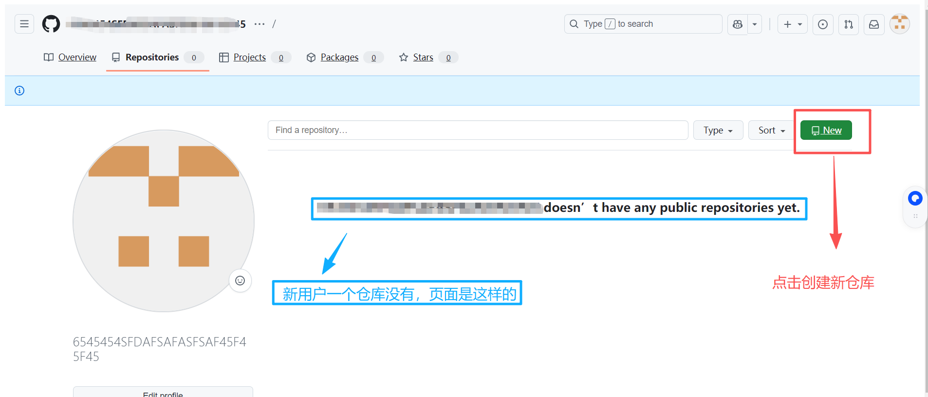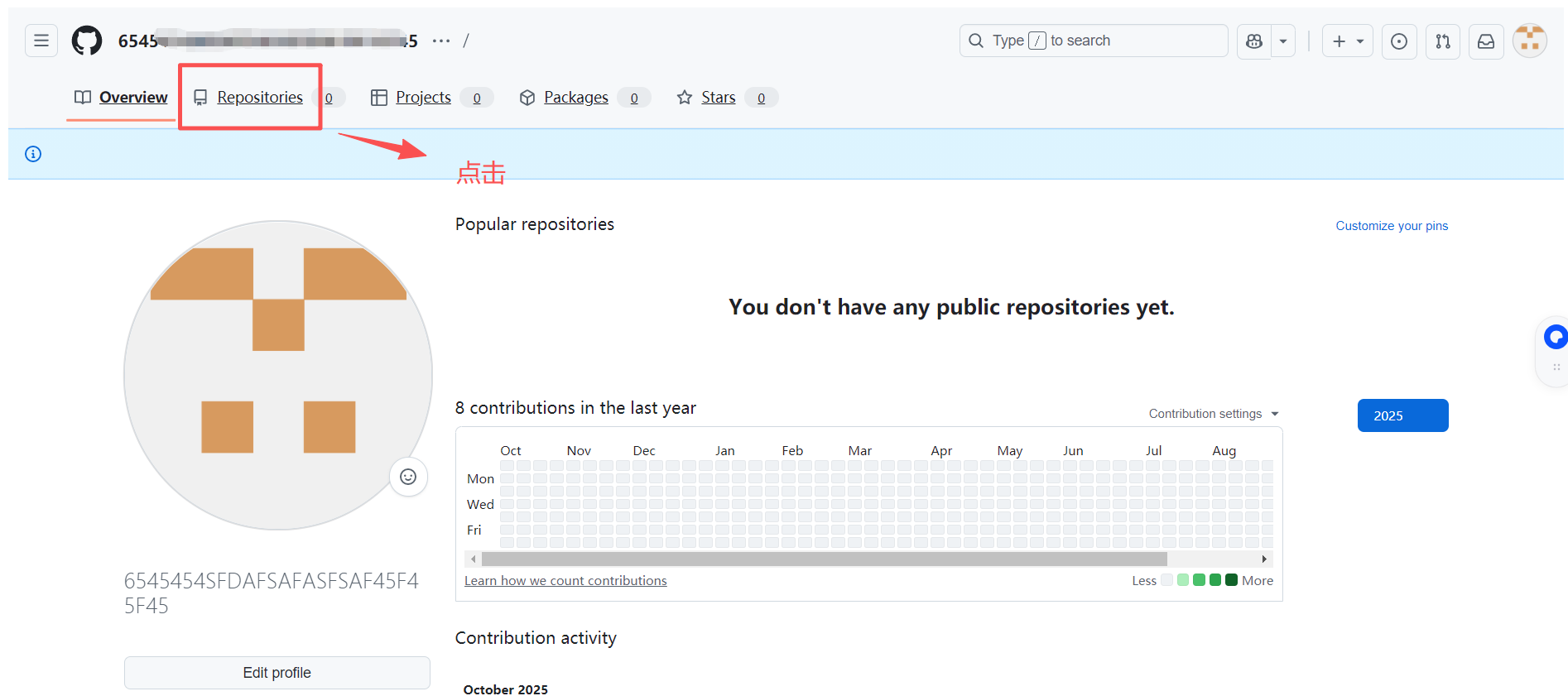 1.登录github后点击用户头像,这时候点击出现profile就会进入下面页面,点击 repositories