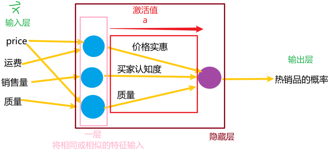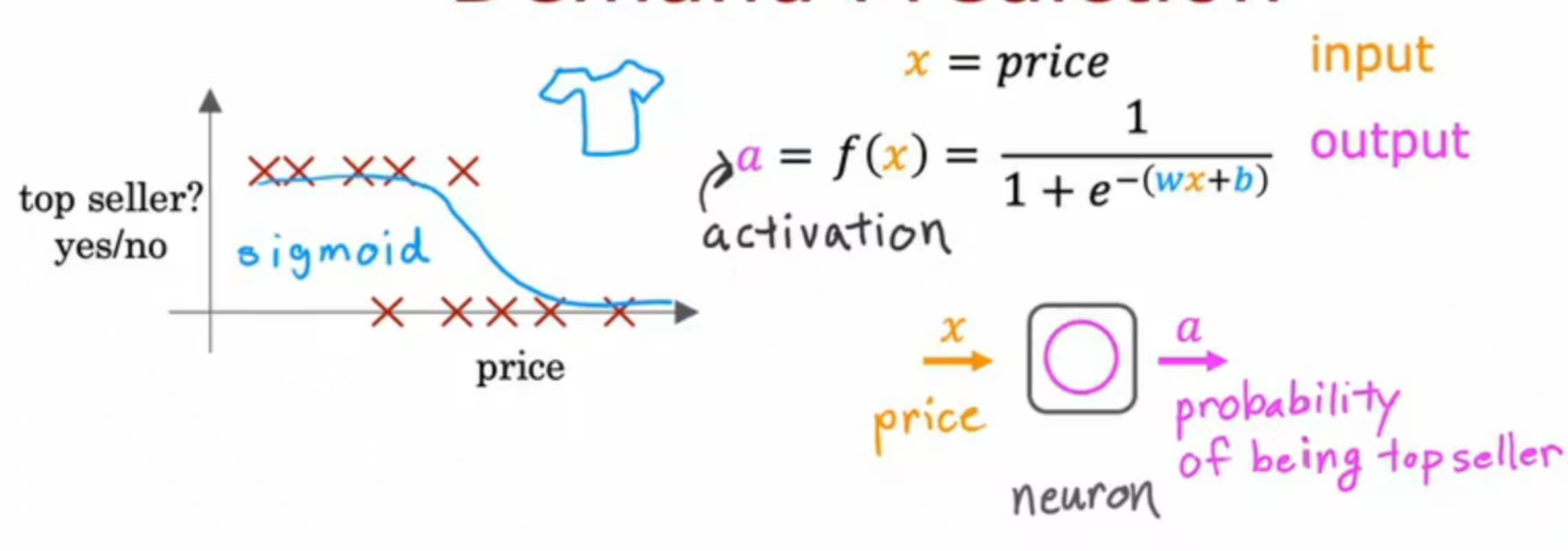 确定T恤是否为畅销品,如图所示,收集了不同价格下销售的不同T恤的数据,横轴表示价格,纵轴判断是否为最热销,假设使用逻辑回归进行拟合,则设该a=f(x),a就是神经网络里面的激活函数,我们将激活函数假设成一个神经元,只要输入价格就对应输出是否为热销品;