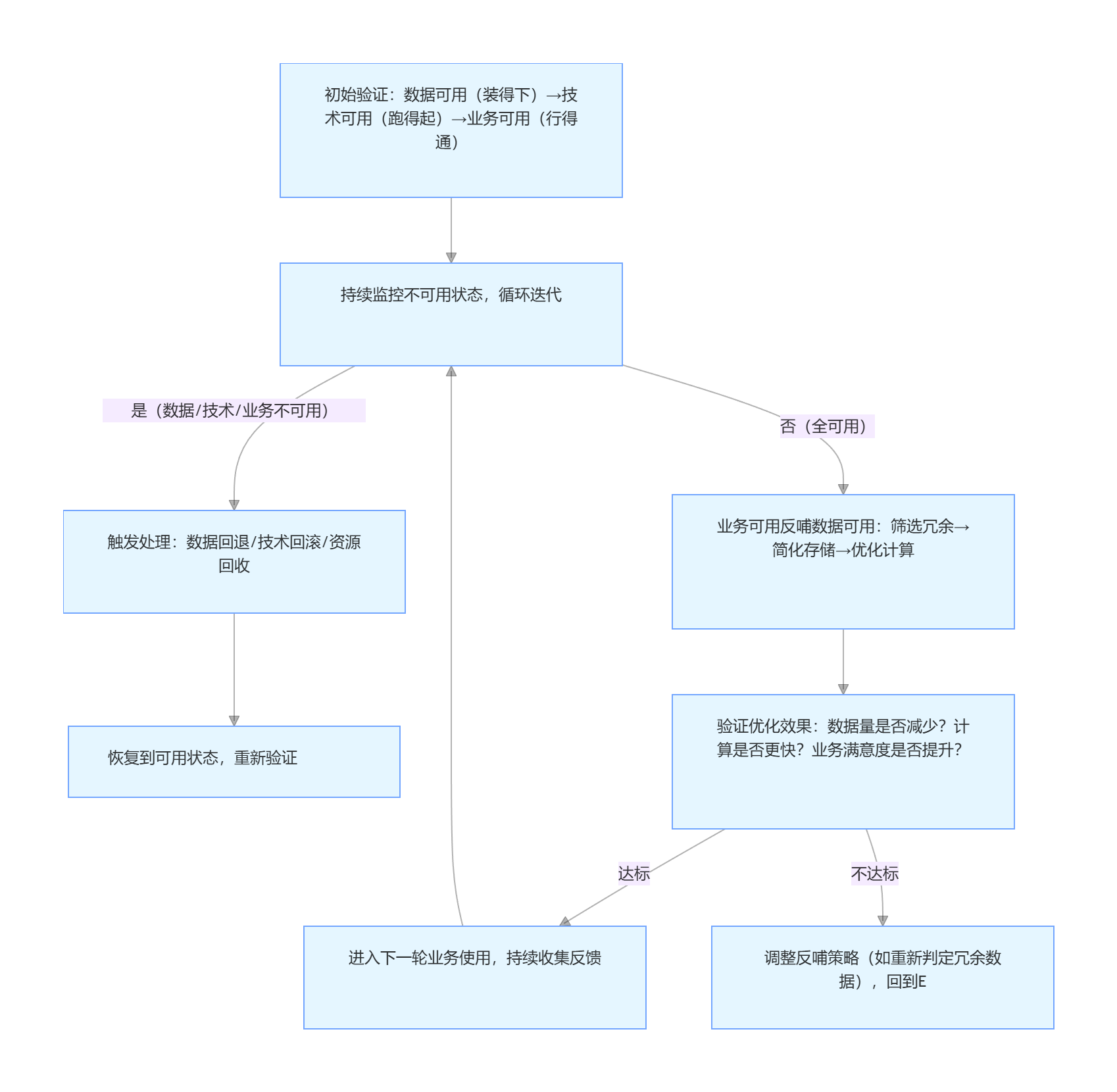 - 双闭环保障:前馈环(Timer 定时修补残片、Counter 分拣边角料、Watcher 回收无用数据)提前拦截不可用;反馈环(Supervisor)跟踪可用状态,触发数据回退、技术回滚、业务召回,同时通过业务反哺简化数据(如剔除冗余的 “符号动态描述”)。