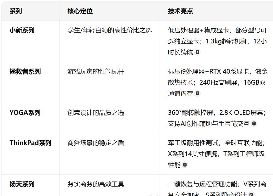 当用户再次搜索“联想笔记本哪个系列好”时,联想乐享将以前端展示的智能解析服务,帮助用户快速定位最适合的笔记本系列。