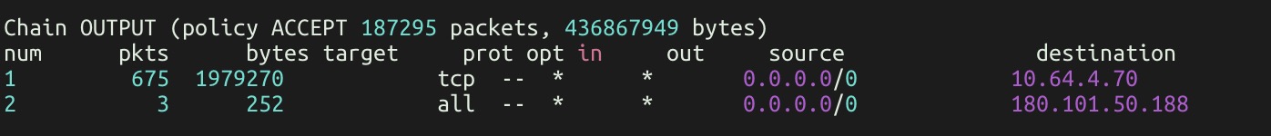 sudo iptables -A OUTPUT -d 10.64.4.70 -p tcp(添加到最后)
