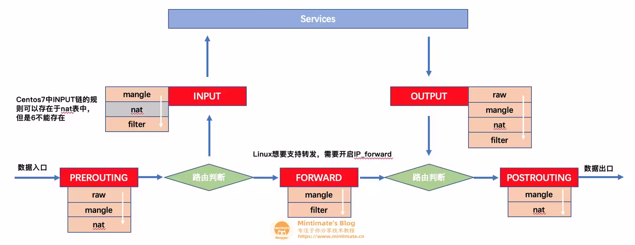首先数据包进入PREROUTING链,之后根据路由决策进入INPUT(本机)还是FORWARD(转发),进入INPUT后会继续进入OUTPUT链,最后都走到POSTROUTING链。