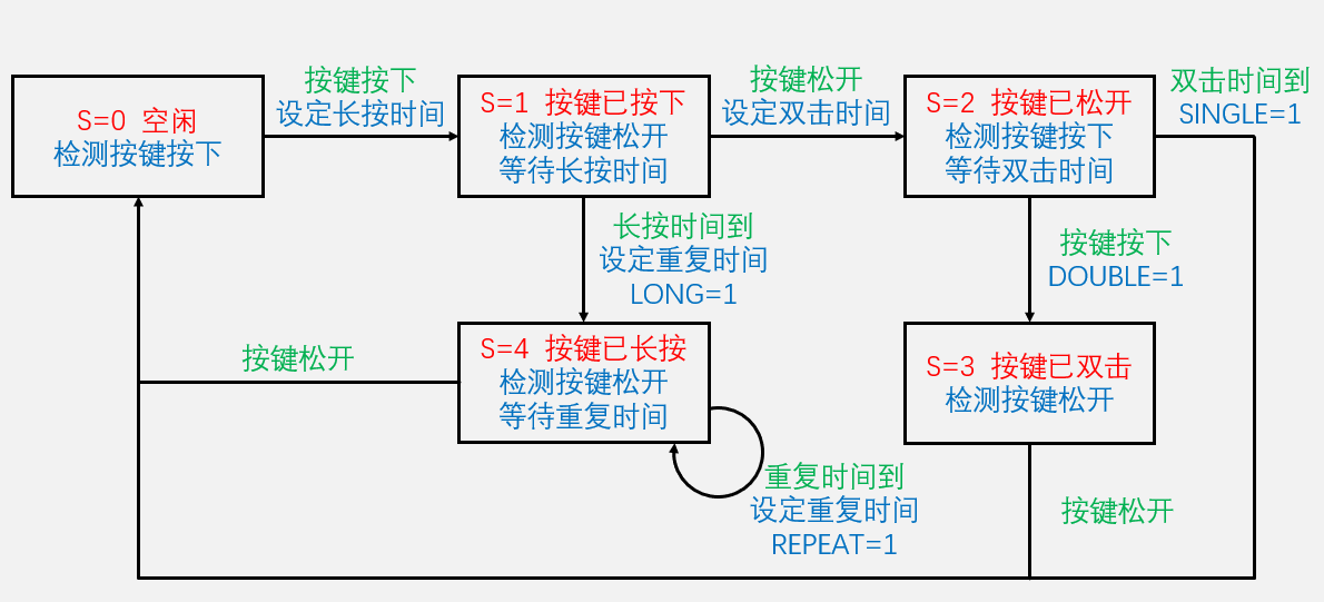 调用Key_Check函数,若指定按键的指定事件发生,则返回1,否则返回0