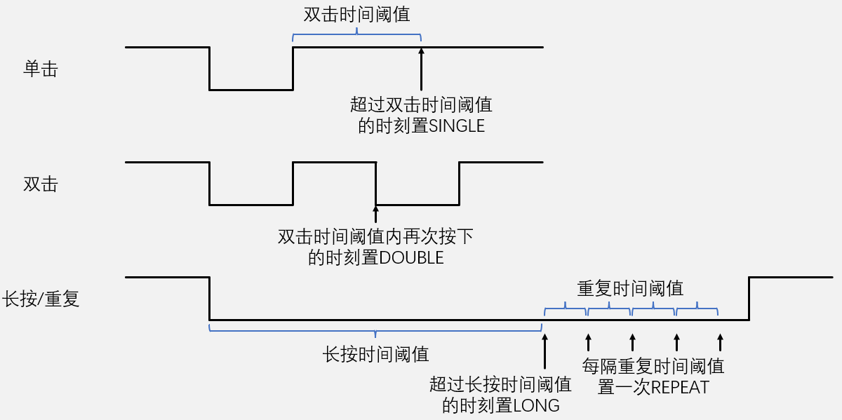 •在一轮主循环中,只能检查一次指定按键的指定事件(KEY_HOLD除外),若确实需要检查多次,则可先调用一次Key_Check函数并用变量存储返回值,后续多次判断此变量即可