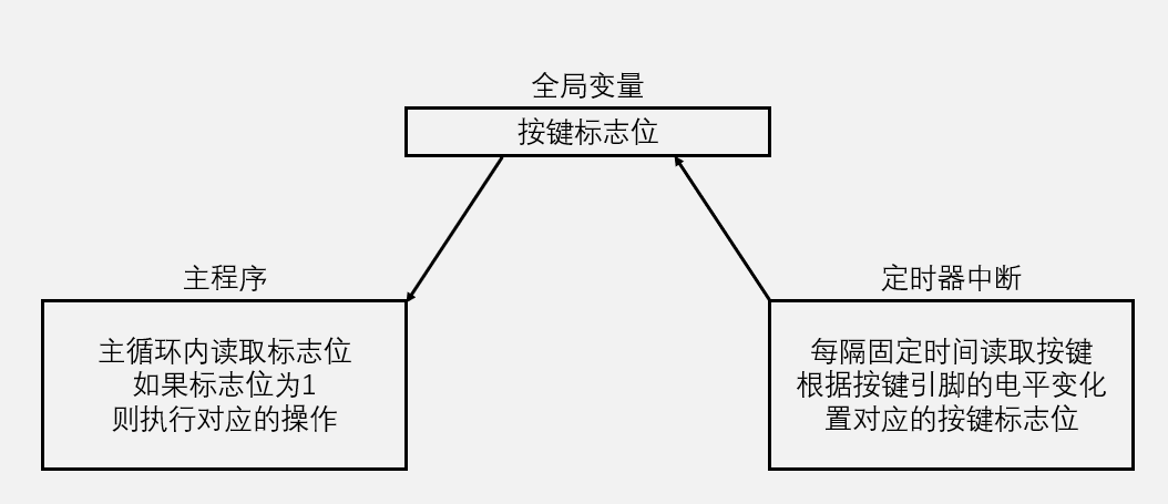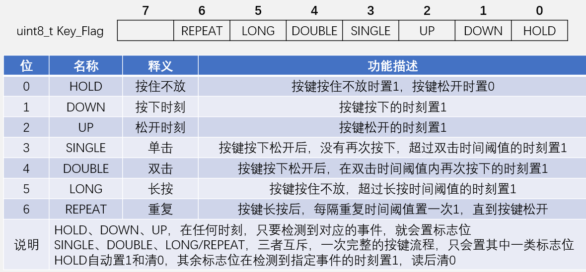 •按键产生了事件,对应的标志位就会一直置1,直到检查了此事件,才会自动清0,这在模式切换时可能会导致误动作(例如:模式1中没有检查过某个标志位,但是按下过按键,此标志位已经置1,随后切换为模式2,开始检查此标志位,那么一旦进入模式2,此标志位的动作就会立刻响应),解决办法是在切换模式时,统一将所有的Key_Flag清0,避免上一个模式的按键标志位对这个模式产生影响