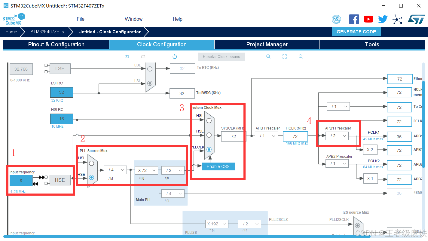 分频系数设置为8,定时器重载值设置为4095,RC振荡器的频率设置为32KHz