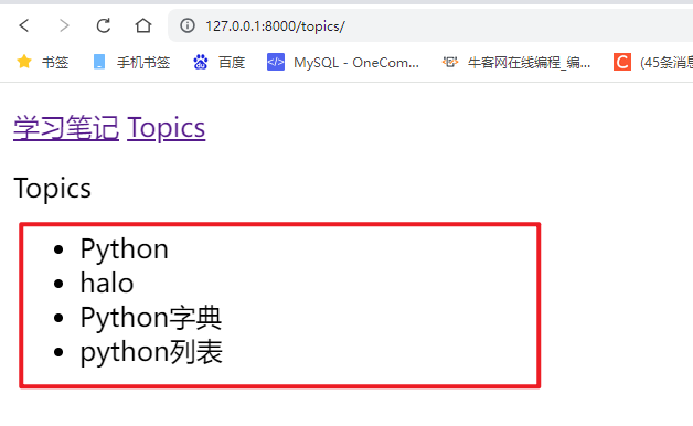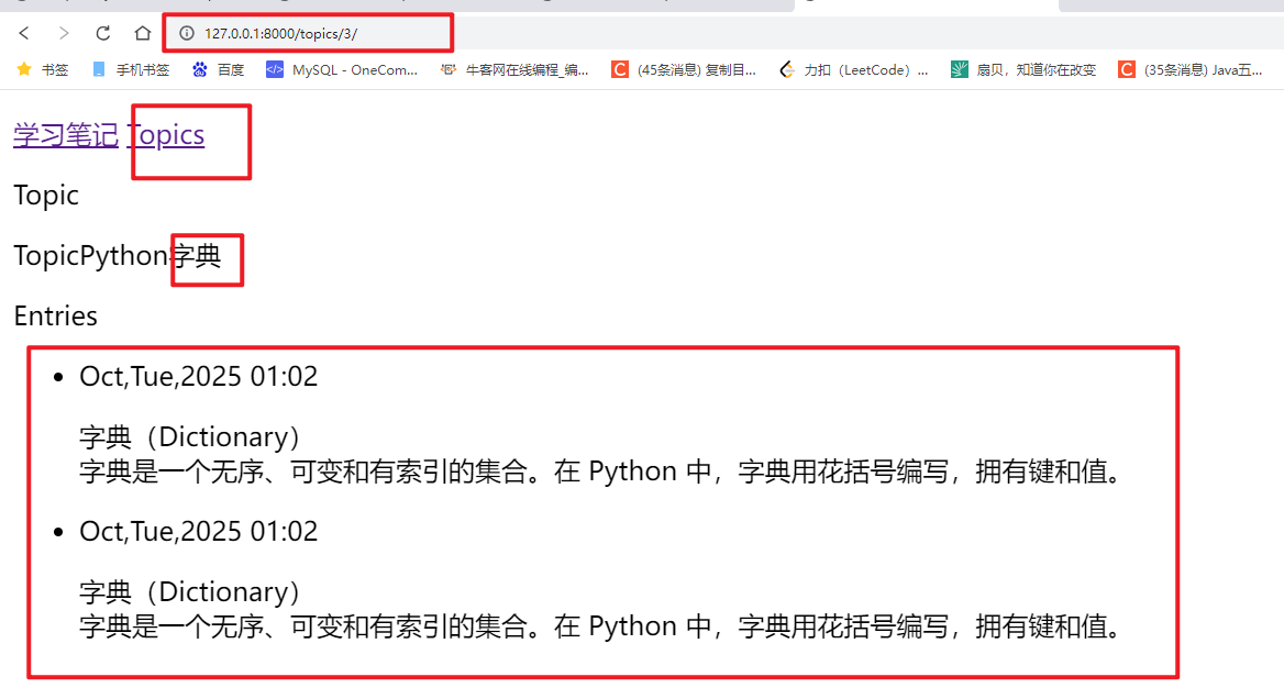 ]### 添加topic业务(view.py)def topic(request, topic_id):topic=Topic.objects.get(id=topic_id)entries=topic.entry_set.order_by('-date_added') ## 对topic条目进行降序排序context={ 'topic':topic, 'entries':entries }return render(request,'learning_logs/topic.html',context)### 创建模板html文件(topic.html)