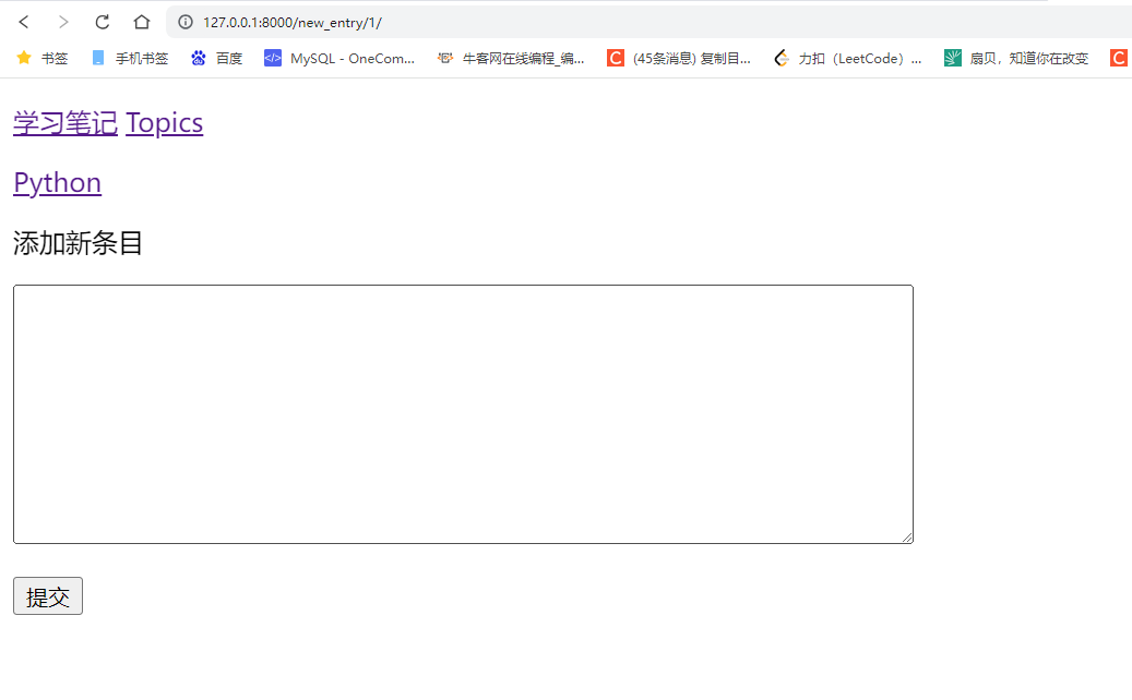 def new_entry(request,topic_id):topic=Topic.objects.get(id=topic_id)if request.method != 'POST':form = EntryForm()else:form = EntryForm(data=request.POST)if form.is_valid():new_entry=form.save(commit=False)new_entry.topic=topicnew_entry.save()return HttpResponseRedirect(reverse('learning_logs:topic',args=[topic_id]))context={'topic':topic,'form':form}return render(request,'learning_logs/new_entry.html',context)## topics.html添加如下内容