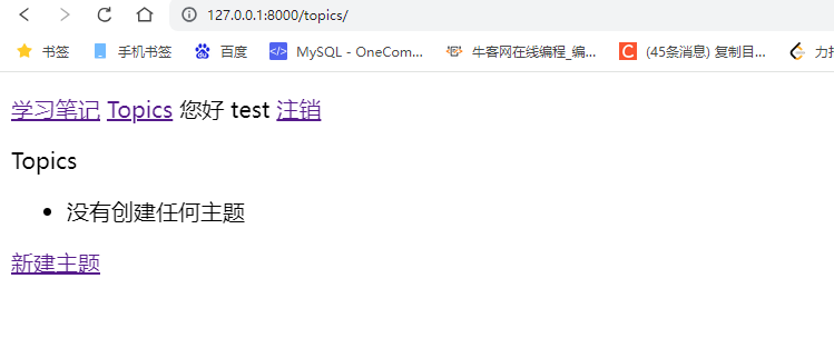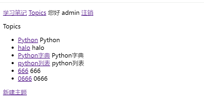from django.urls import reverse# Create your views here.def logout_view(request):logout(request)return HttpResponseRedirect(reverse('learning_logs:index'))### base.html文件<p><a href="{% url 'learning_logs:index' %}">学习笔记</a><a href="{% url 'learning_logs:topics' %}">Topics</a>{% if user.is_authenticated %}您好 {{ user.username}}<a href="{% url 'users:logout' %}">注销</a>{% else %}<a href="{% url 'users:login' %}">登录</a>{% endif %}</p>