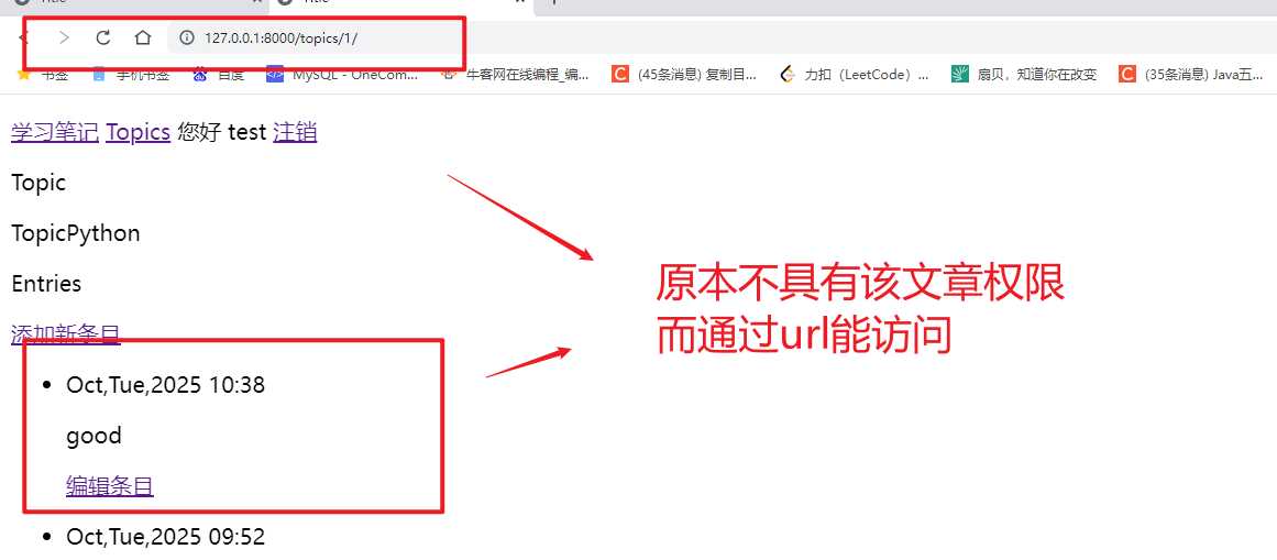 def topic(request, topic_id):topic=Topic.objects.get(id=topic_id)if topic.owner !=request.user: ## 设置404权限认证raise Http404entries=topic.entry_set.order_by('-date_added') ## 对topic条目进行降序排序context={ 'topic':topic, 'entries':entries }return render(request, 'learning_logs/topic.html',context)@login_required ###添加权限认证