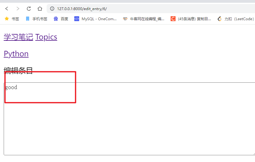 def edit_entry(request,entry_id):entry=Entry.objects.get(id=entry_id)topic=entry.topicif request.method!='POST':form = EntryForm(instance=entry) ## 将实例装入表格中else:form=EntryForm(instance=entry,data=request.POST)if form.is_valid():form.save()return HttpResponseRedirect(reverse('learning_logs:topic',args=[topic.id]))context={'entry':entry,'topic':topic,'form':form}return render(request,'learning_logs/edit_entry.html',context)## 编写edit_entry.html