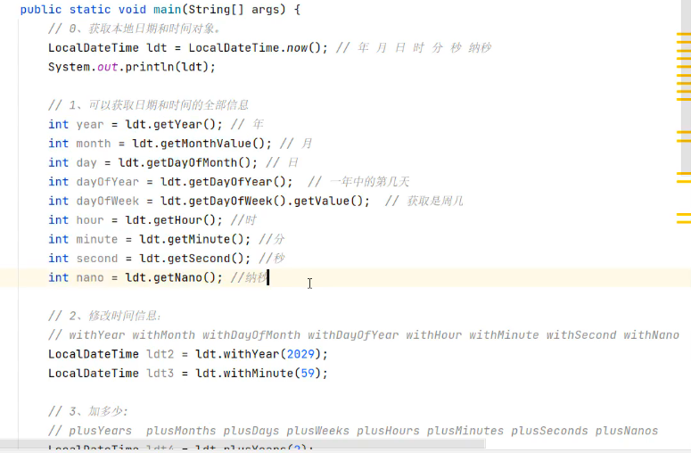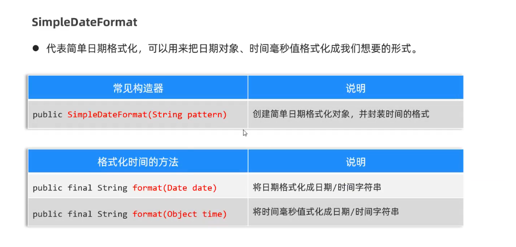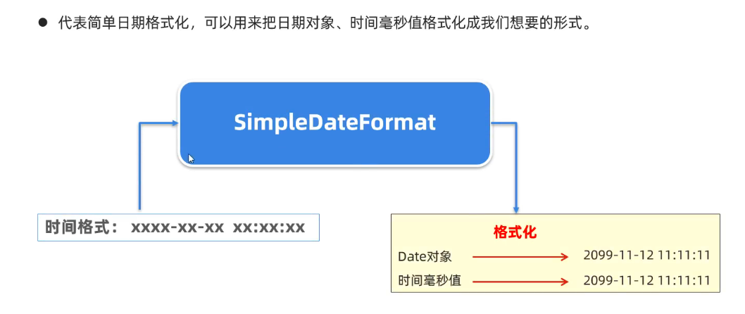 // 掌握SimpleDateFormat 的使用// 1.创建一个date对象Date date = new Date();System.out.println(date);// 2.获取date对象的时间毫秒值long time = date.getTime();System.out.println(time);// 3.使用SimpleDateFormat格式化date对象 SimpleDateFormat sdf = new SimpleDateFormat("yyyy-MM-dd HH:mm:ss EEE a");String format = sdf.format(date);String format1 = sdf.format(time);System.out.println(format1); //2025-10-08 12:27:01 周三 下午System.out.println(format); //2025-10-08 12:27:01 周三 下午