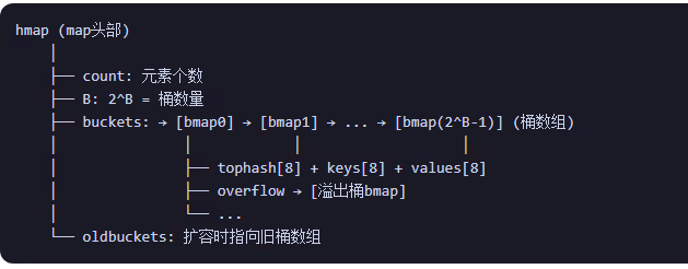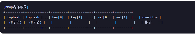 type bmap struct {tophash [8]uint8 // 8个哈希值高8位(用于快速比较)// 后面跟着8个key和8个value(内存中连续存储)// 最后是一个指向溢出桶的指针