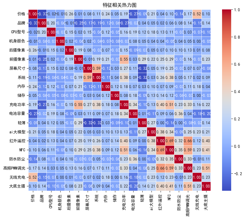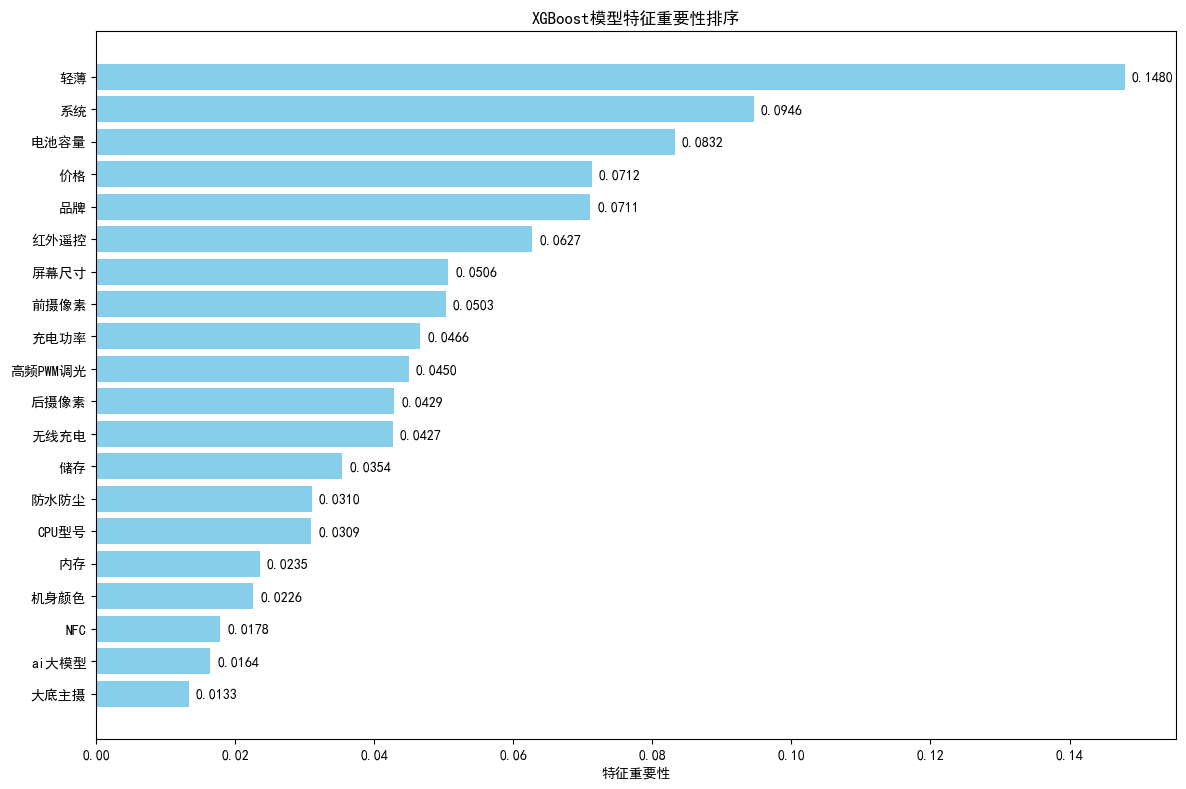 feature_names = ['价格', '品牌', 'CPU型号', '机身颜色', '后摄像素', '前摄像素', '屏幕尺寸', '系统', '内存', '储存', '充电功率', '电池容量', '轻薄', 'ai大模型', '红外遥控', 'NFC', '防水防尘', '高频PWM调光', '无线充电', '大底主摄']# 获取特征重要性