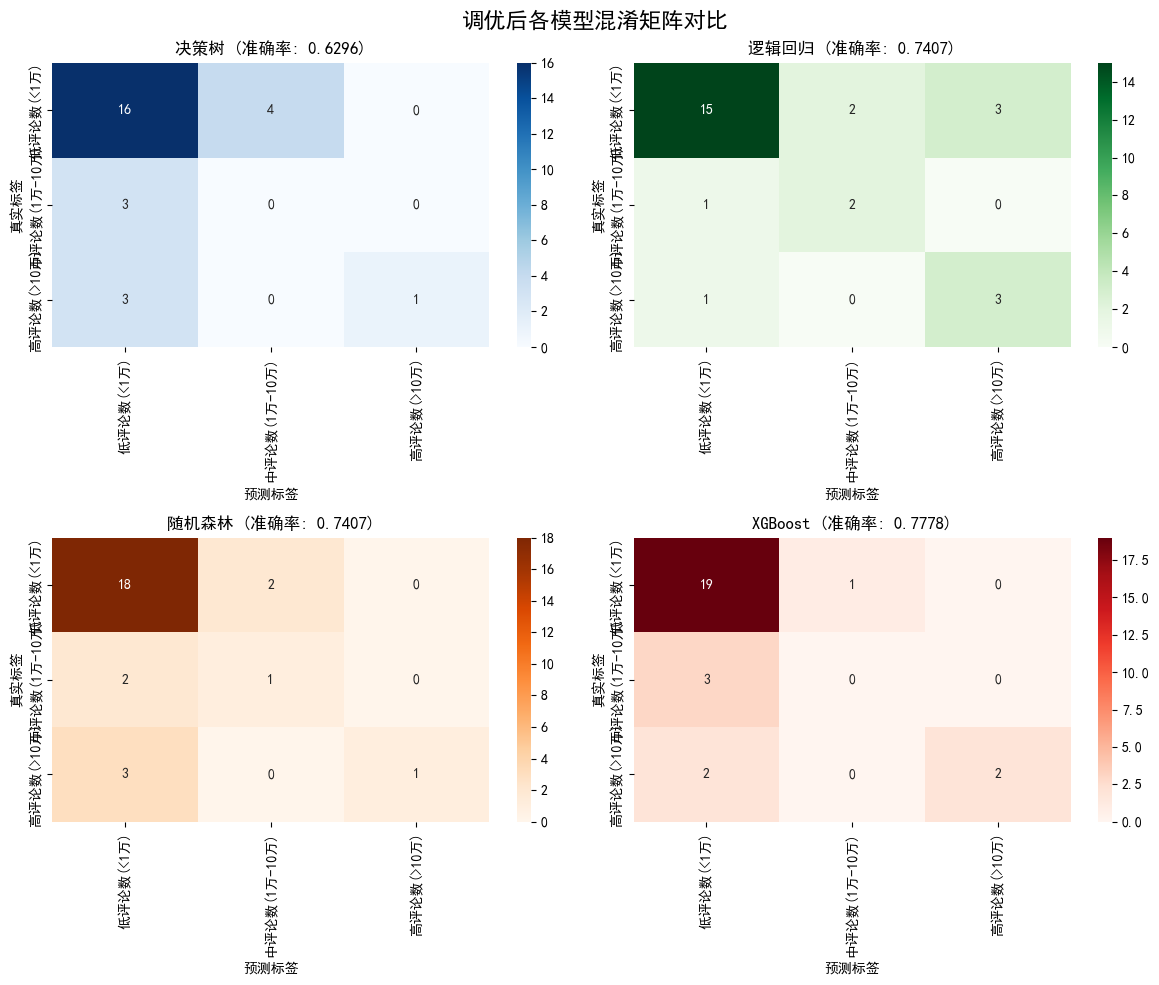 labels = ['低评论数(<1万)', '中评论数(1万-10万)', '高评论数(>10万)']# 决策树混淆矩阵