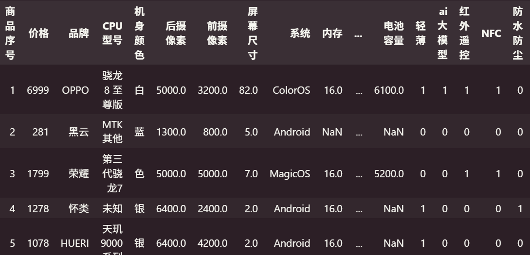 可以看出,部分特征(如内存,电池容量)存在缺失值,需要进行预处理提高数据质量。