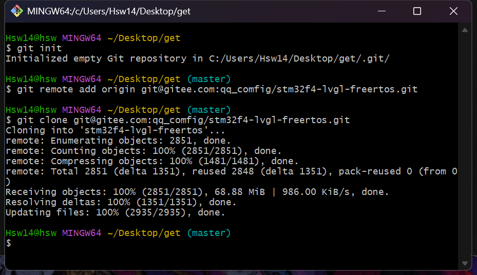 创建一个准备获取文件的文件夹,打开gitee终端,输入指令