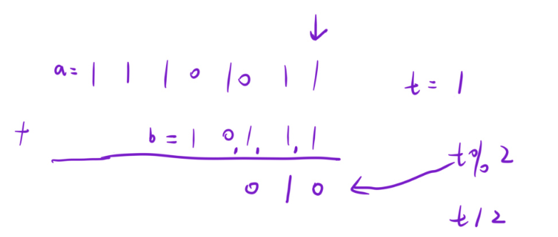 由于列竖式运算是从后往前计算,所以我们从后往前遍历字符串a和字符串b,将每次遍历到的数字提取出来,创建一个变量t来记录进位情况,此时还要创建一个字符串ret来记录每一位相加的结果,每次让ret.appned(t%2),t%2是因为只需要相加结果的个为即可