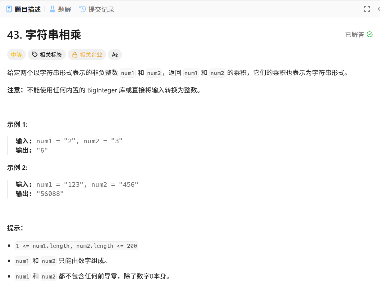题目链接:43. 字符串相乘 - 力扣(LeetCode)