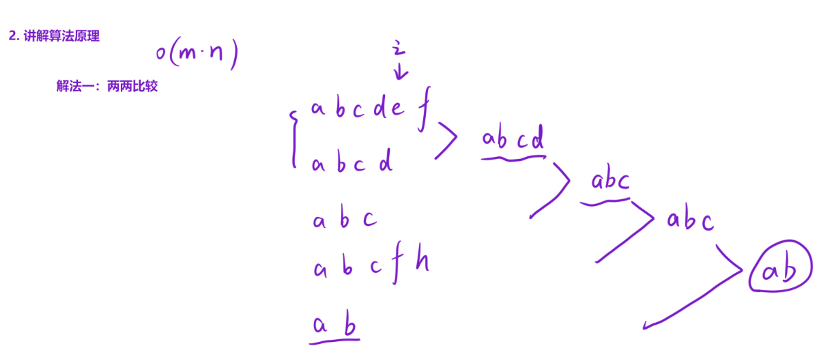 先将第一个字符串和第二个字符串的最长公共前缀获取到,假设这个最长前缀为str,然后再拿这个str和第三个字符串比较,知道将所有字符串都两两比较一遍