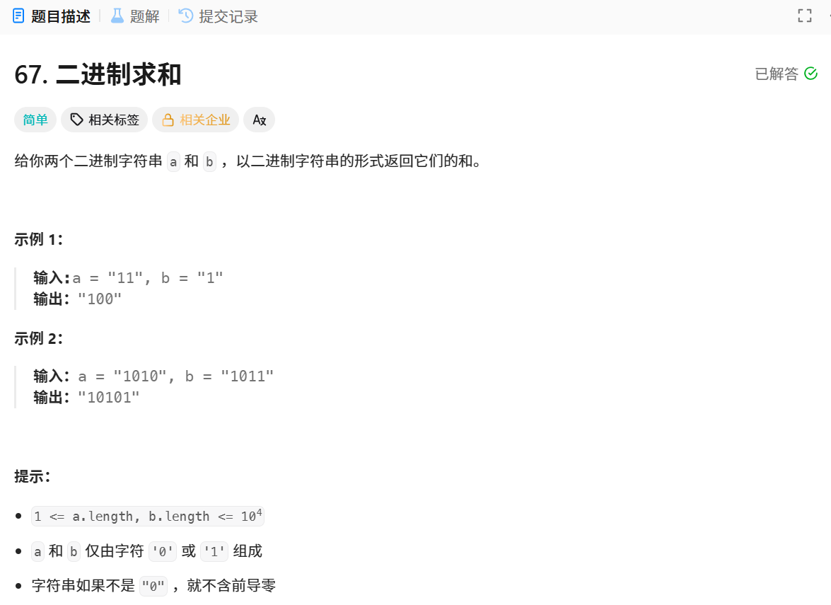 题目链接:67. 二进制求和 - 力扣(LeetCode)
