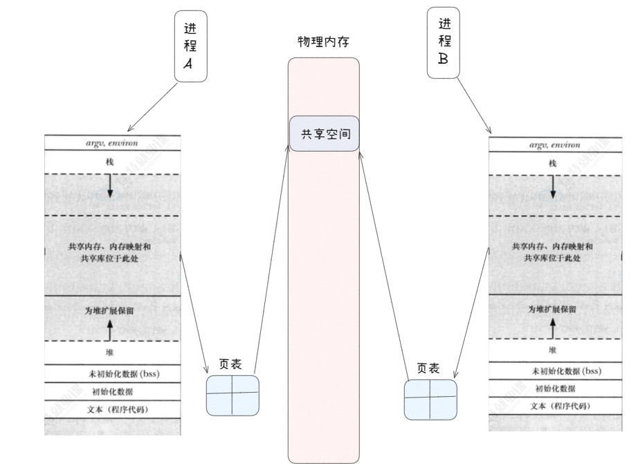 之前我们讲进程地址空间时,提到堆栈中间有一段共享区。我们可以想办法在物理内存中先创建一块区域,然后映射到共享区中。同样地,这块空间可以映射到另一个进程的地址空间中,就类似于动态库的共享原理。