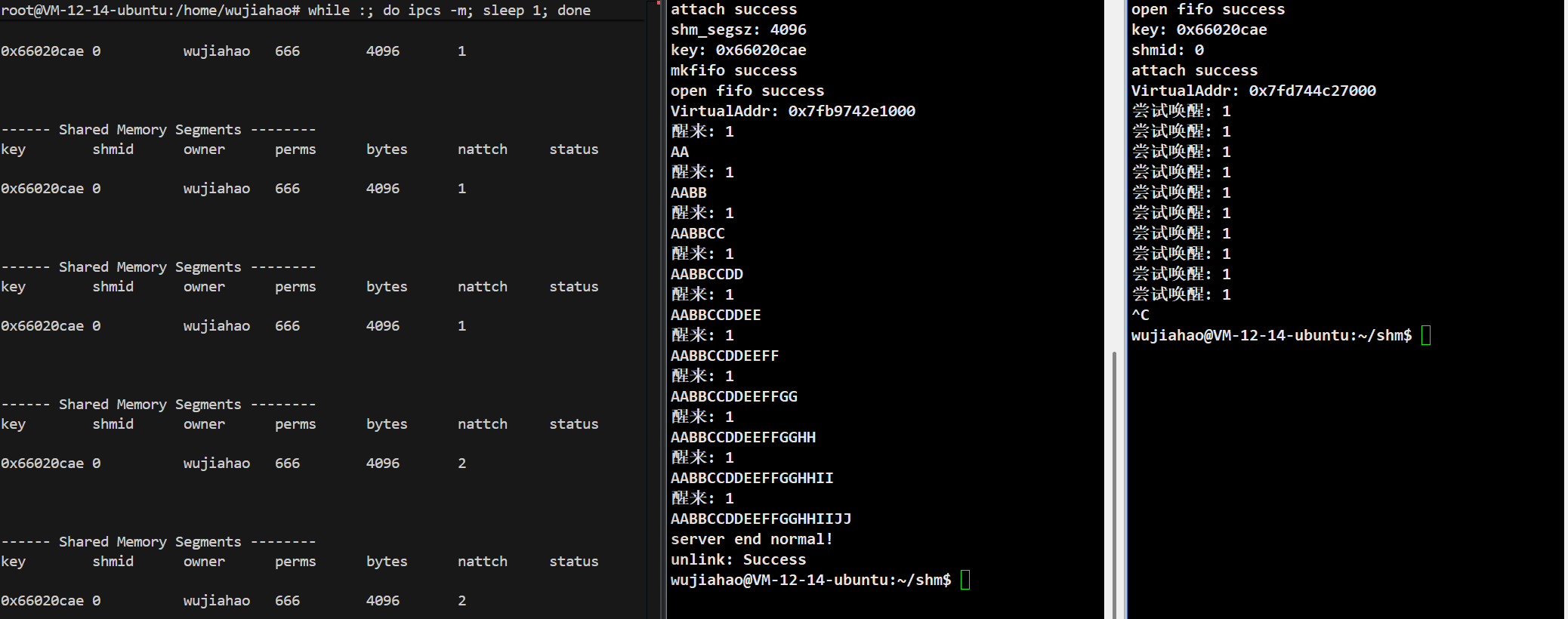 {Shm shm(pathname, projid, CREATER);sleep(5);shm.Attr();NamedFifo fifo(PATH, FILENAME);// 文件操作FileOper readerfile(PATH, FILENAME);readerfile.OpenForRead();char *mem = (char *)shm.VirtualAddr();while (true){if (readerfile.Wait()){printf("%s\n", mem);}elsebreak;}readerfile.Close();std::cout << "server end normal!" << std::endl; // server段的析构函数没有被成功调用!return 0;