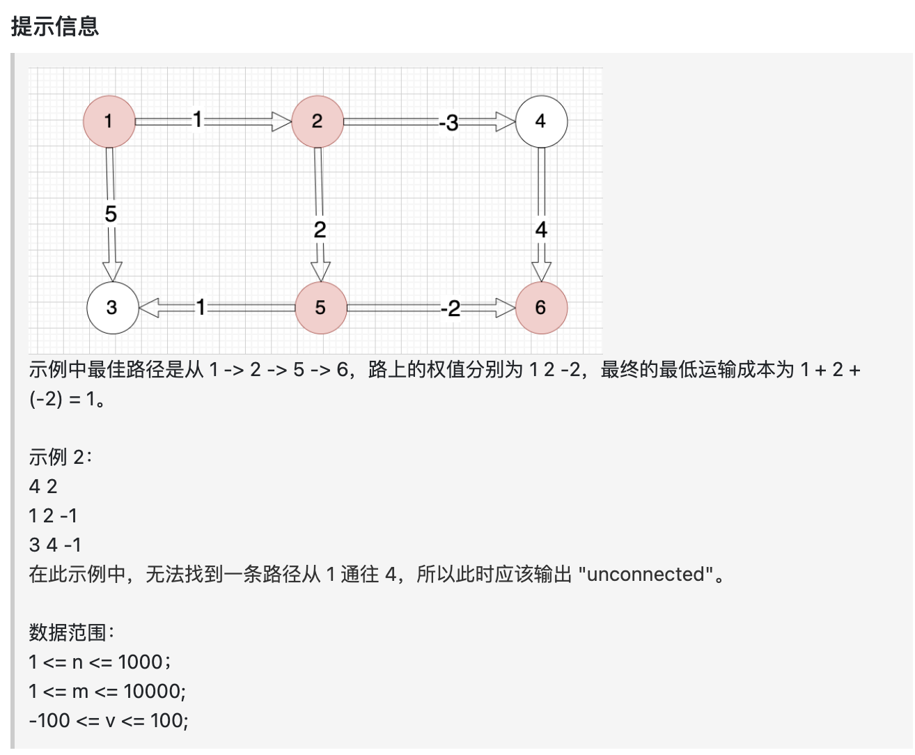 如果能够从城市 1 到连通到城市 n, 请输出一个整数,表示运输成本。如果该整数是负数,则表示实现了盈利。如果从城市 1 没有路径可达城市 n,请输出 "unconnected"。