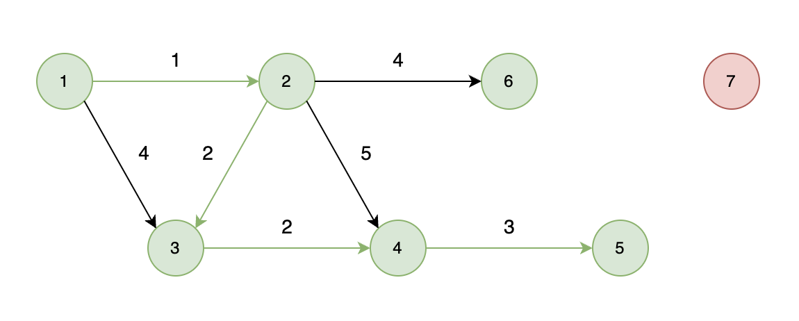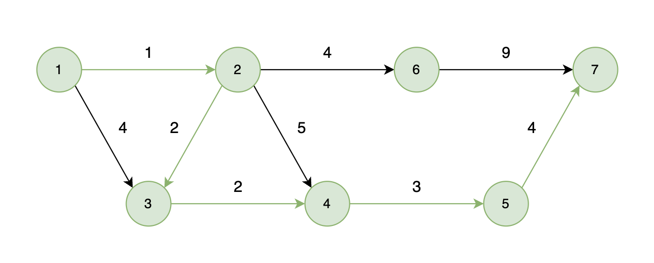 如下图所示,起始车站为 1 号车站,终点车站为 7 号车站,绿色路线为最短的路线,路线总长度为 12,则输出 12。