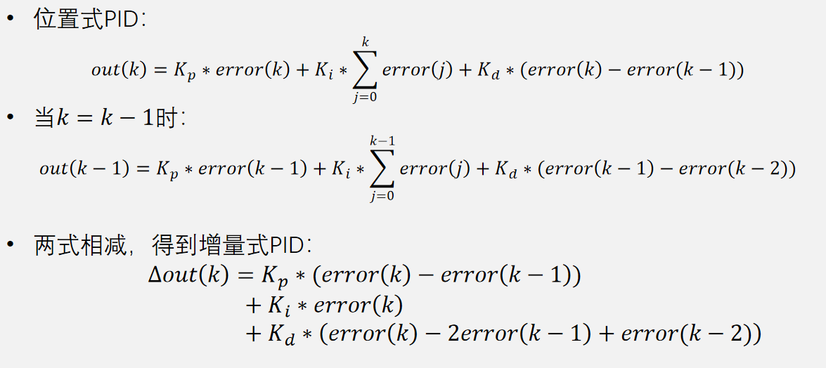 增量式PID由位置式PID推导得到,每次计算得到的是输出值的增量,如果直接给被控对象,则需要被控对象内部有积分功能 增量式PID也可在控制器内进行积分,然后输出积分后的结果,此时增量式PID与位置式PID整体功能没有区别 位置式PID和增量式PID计算时产生的中间变量不同,如果对这些变量加以调节,可以实现不同的特性