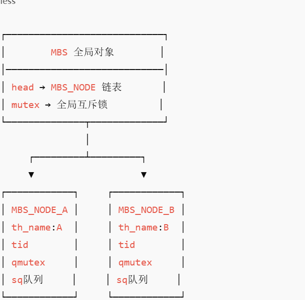 typedef struct {struct list_head head; // 所有线程节点链表头pthread_mutex_t mutex; // 全局互斥锁 } MBS;