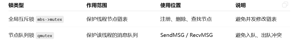 🔹 每个线程节点都有自己的消息队列和互斥锁。