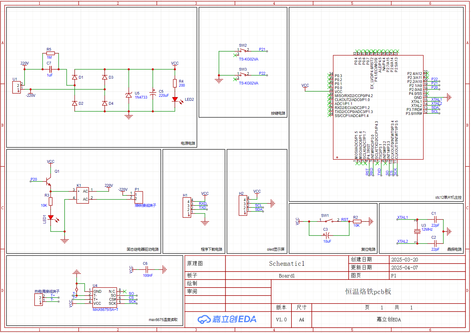 单片机通过PWM输出控制固态继电器,固态继电器控制烙铁是否加热,热电偶读取烙铁的温度,反馈给单片机,oled实时显示当前控制进度,不断循环这个过程,来完成这个过程