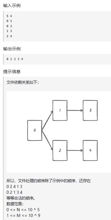 import java.util.*;public class Main {public static void main(String[] args) {Scanner scanner = new Scanner(System.in);int n = scanner.nextInt();int m = scanner.nextInt();List<List<Integer>> umap = new ArrayList<>(); // 记录文件依赖关系int[] inDegree = new int[n]; // 记录每个文件的入度for (int i = 0; i < n; i++)umap.add(new ArrayList<>());for (int i = 0; i < m; i++) {int s = scanner.nextInt();int t = scanner.nextInt();umap.get(s).add(t); // 记录s指向哪些文件inDegree[t]++; // t的入度加一}Queue<Integer> queue = new LinkedList<>();for (int i = 0; i < n; i++) {if (inDegree[i] == 0) {// 入度为0的文件,可以作为开头,先加入队列queue.add(i);}}List<Integer> result = new ArrayList<>();// 拓扑排序while (!queue.isEmpty()) {int cur = queue.poll(); // 当前选中的文件result.add(cur);for (int file : umap.get(cur)) {inDegree[file]--; // cur的指向的文件入度-1if (inDegree[file] == 0) {queue.add(file);}}}if (result.size() == n) {for (int i = 0; i < result.size(); i++) {System.out.print(result.get(i));if (i < result.size() - 1) {System.out.print(" ");}}} else {System.out.println(-1);}}