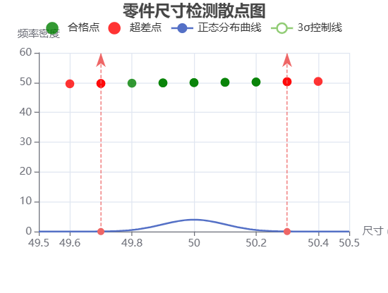 "绘制零件尺寸检测散点图: 标准值:50±0.2mm 用绿色标注合格点(49.8≤x≤50.2),红色标注超差点, 添加正态分布曲线和3σ控制线"