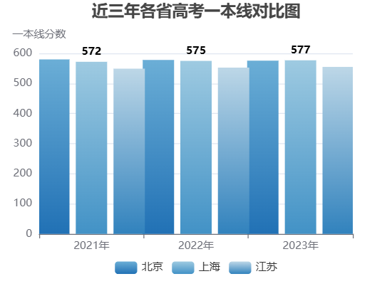 "生成近三年各省高考一本线对比图: 2021年:北京580 上海572 江苏549 2022年:北京578 上海575 江苏553 2023年:北京576 上海577 江苏555 按省份分系列使用渐变蓝色系,为上海系列添加数据标签"