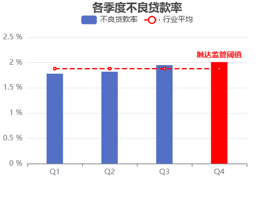 "绘制各季度不良贷款率柱状图: Q1:1.78% Q2:1.82% Q3:1.95% Q4:2.01% 添加行业平均参考线(1.88%),用红色标记超过2%的数据点, 在Q4柱子添加'触达监管阈值'文字标注"