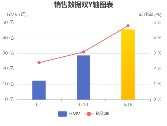 "创建销售数据双Y轴图表: 左轴GMV(柱状图),右轴转化率(折线图) 日期 GMV(亿) 转化率(%) 6.1 12.3 2.4 6.10 28.7 3.1 6.18 45.6 4.8 将6.18柱子改为渐变金色,图例放置在图表下方"