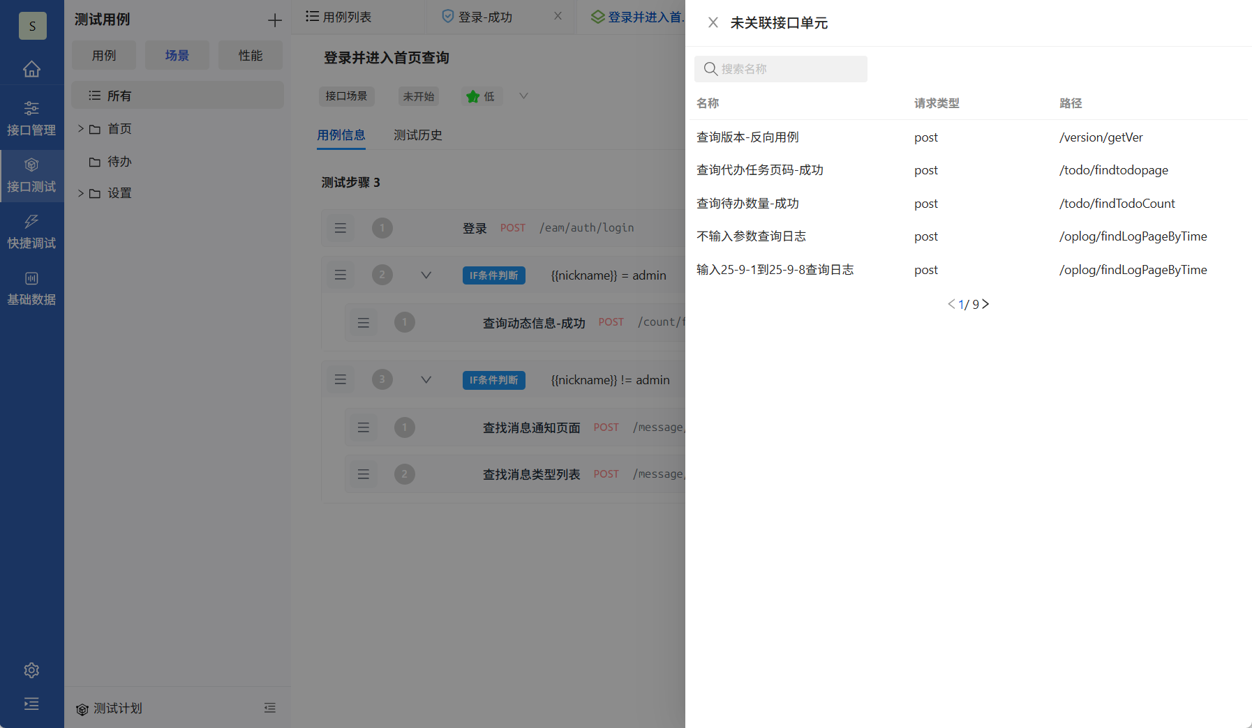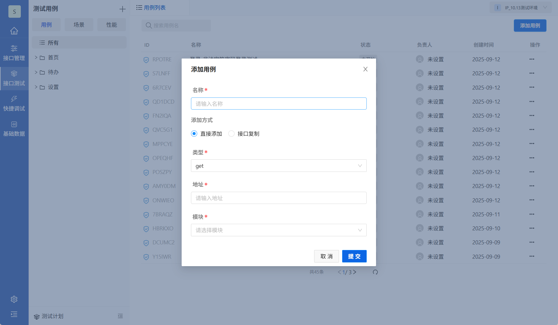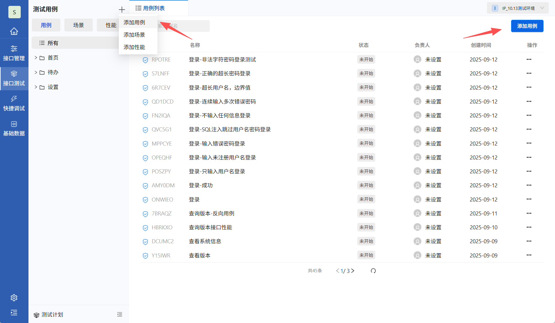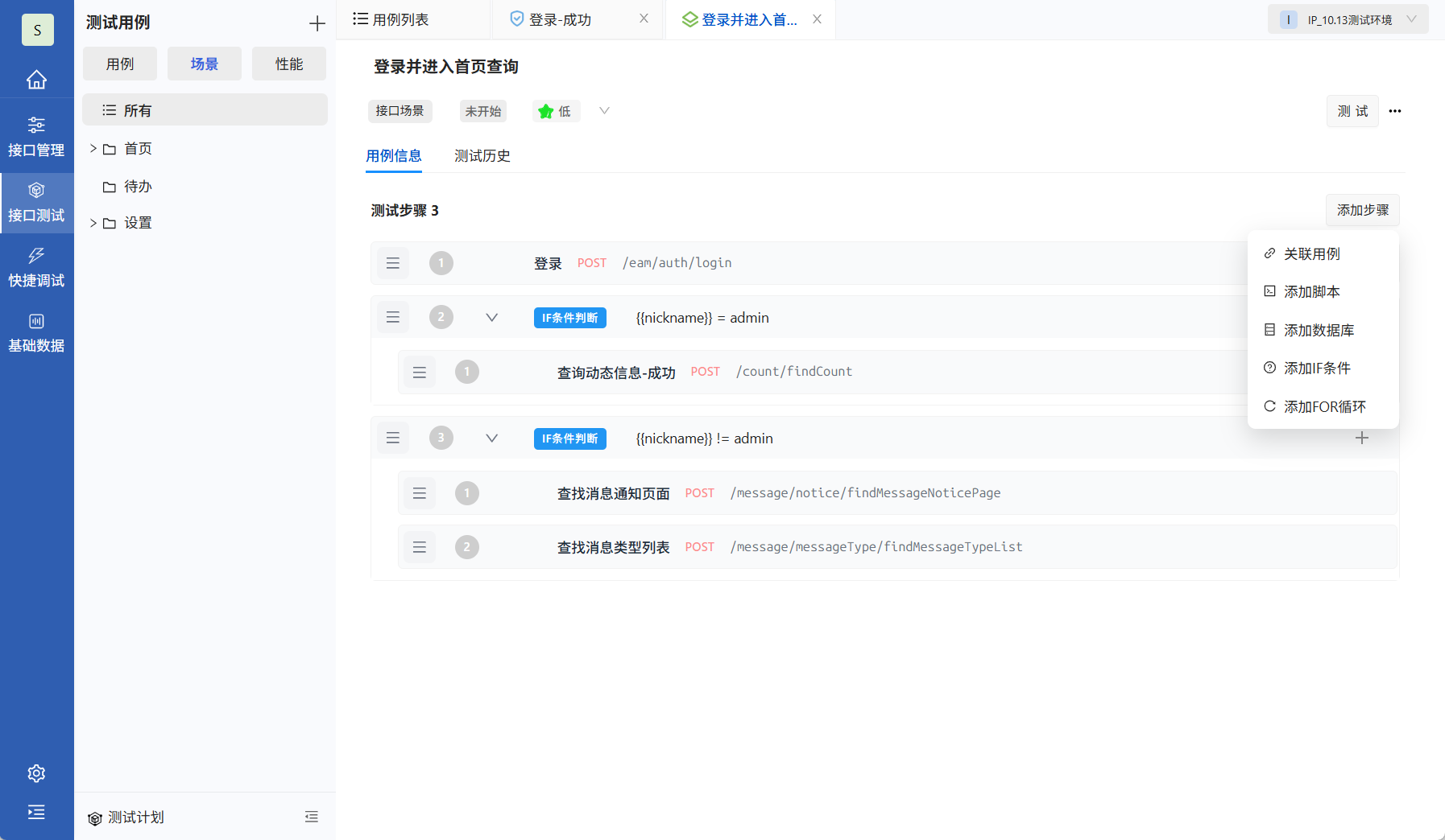 接口场景用例用于构建复杂的接口测试场景,模拟真实业务流程。测试用例采用先新增后编辑详细信息的模式,点击“+”→添加场景。