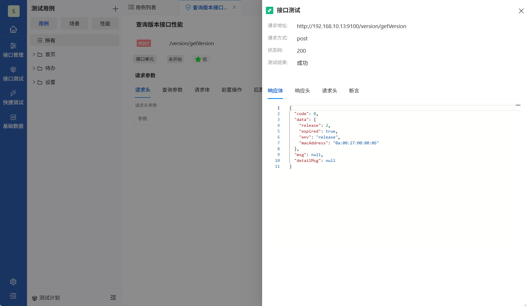 维护接口用例后,点击接口用例名称,进入接口详情编辑,在接口用例详情也可以对接口进行测试。用例测试使用的环境和接口管理一致。用例测试前需要选择用例测试环境,选择环境后点击测试按钮。
