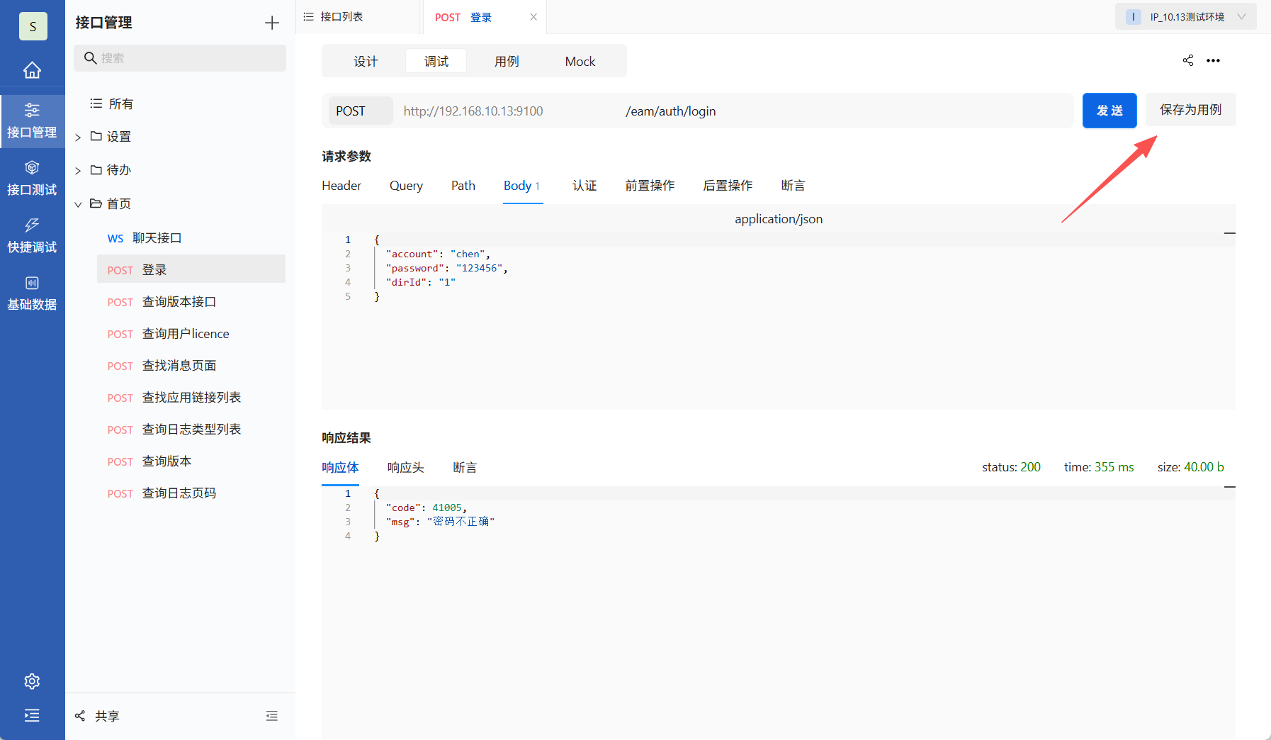 在接口管理,点击调试tab,发送调试后,可将当前调试参数保存为用例。