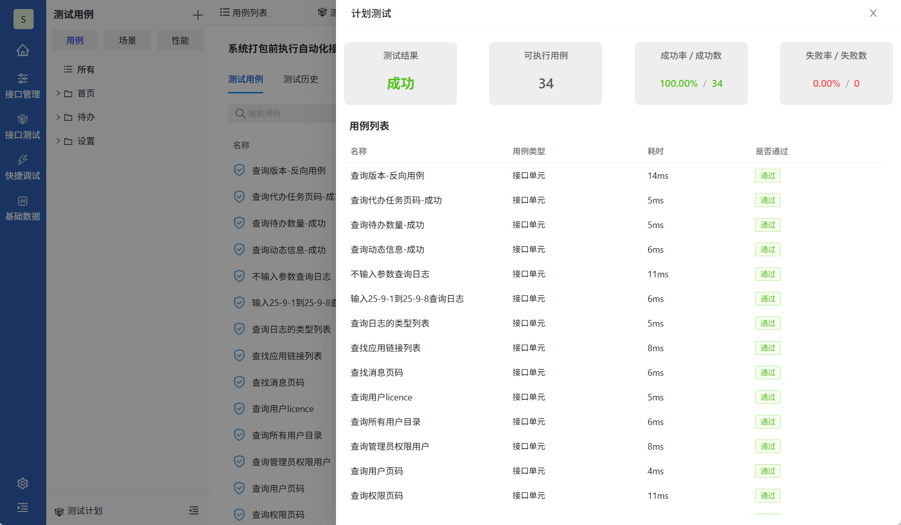 在测试计划选择环境,点击测试,执行测试计划所有用例。弹窗显示测试结果。测试结果包含总体测试结果、执行用例数量、通过/失败数量、通过率/失败率、耗时、以及每个用例执行情况。