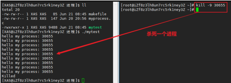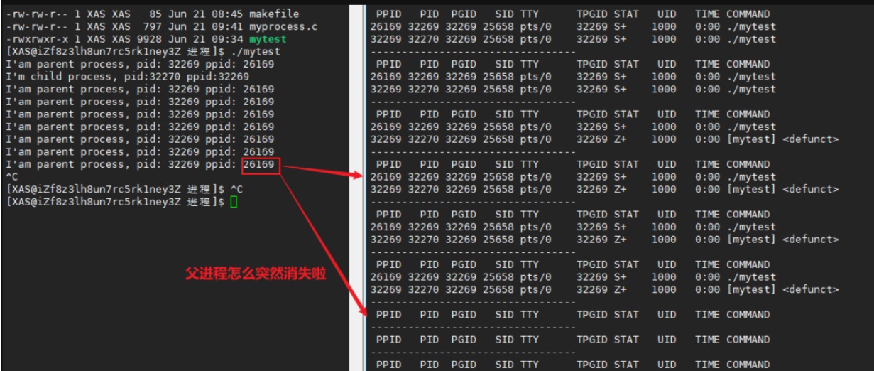 - 那看到下面我们将这个进程突然终止之后,父子进程都不见了