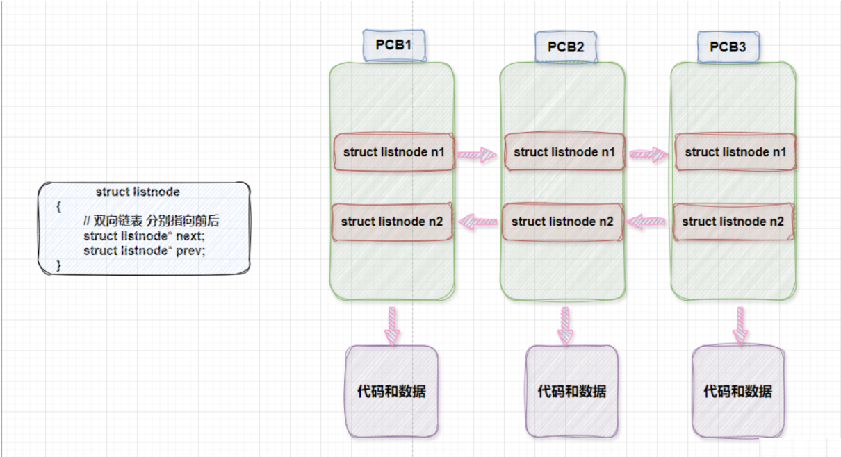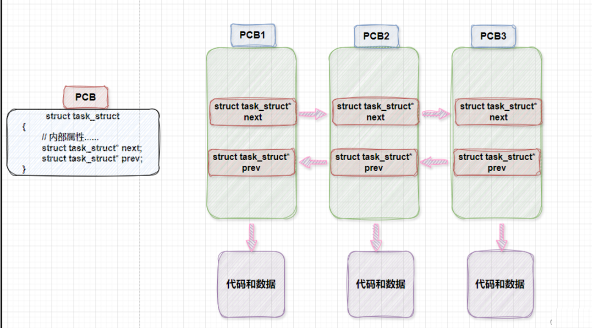 - 首先对于一个进程而言,我们知道它是由 内核数据结构 + 所对应的代码和数据 所组成的,所以当系统中存在多个进程的时候就势必会存在多个结构体;当然我们需要将这些进程给链接组织起来(双向链表链接)