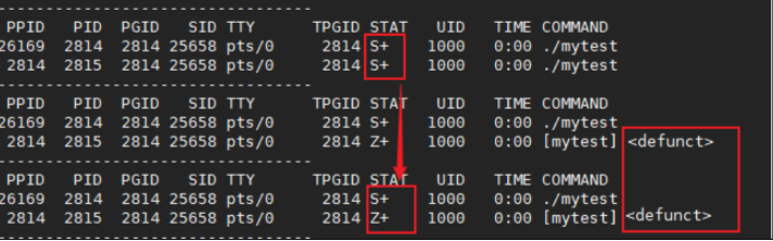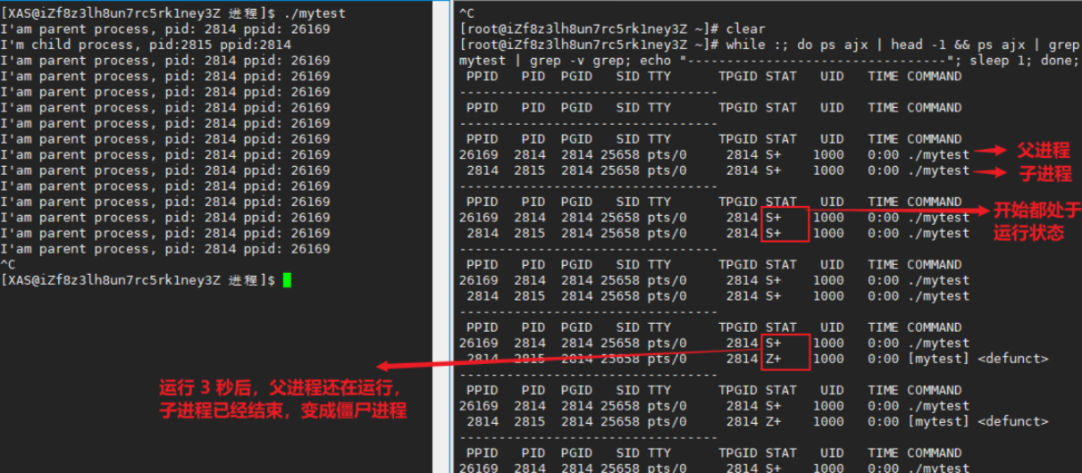 仔细地来看一下这个状态的变化,其中【PID】为 2815,其父进程为 2814,一开始它们均为S 睡眠状态,但是呢到了后面子进程的状态就变成了Z僵死状态。也就意味着此时子进程已经死亡了,但是父进程还不知道