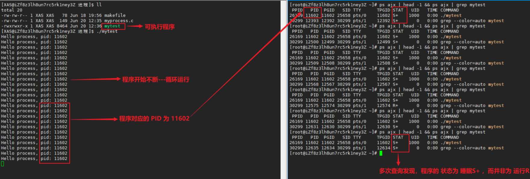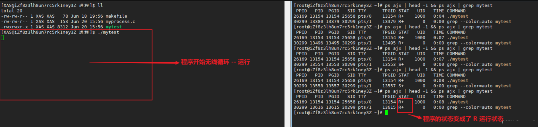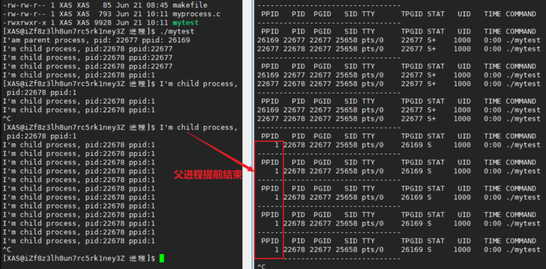 - 然后通过进程状态追踪来看看,我们观察到一开始两个父进程和子进程是同步在走的,但是呢过了一会父进程终止了,只有子进程还在跑,此时我们需要留意的不是其进程状态,而是这个子进程的