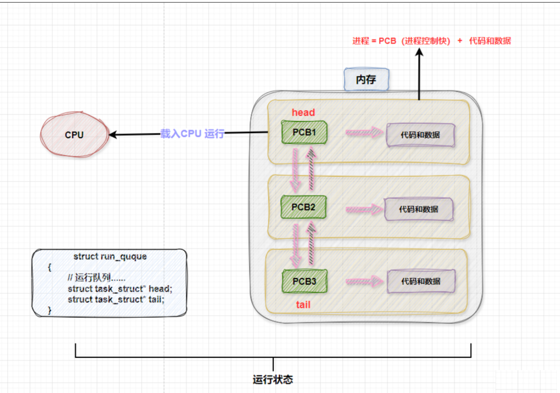 - 那么这些 进程 就相当于是在处在一个运行队列中,我们如果要找到这个队列中的某个进程的话,只需要找到这个进程的头部即可,那我们就可以对应地去调度某个进程,把这个进程所对应的代码和数据放到CPU上去执行