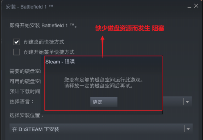上下载游戏,当你点击下载按钮后提示磁盘空间不足,此时是无法运行steam下载