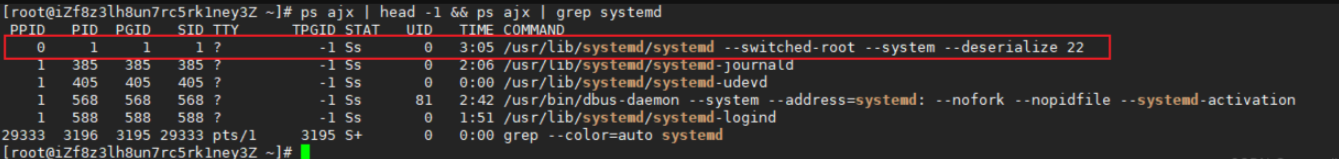 的值为1的进程,我们一般将其称作为是【系统进程】。我们可以使用下面这句指令去查找一下ps ajx | head -1 && ps ajx | grep systemd