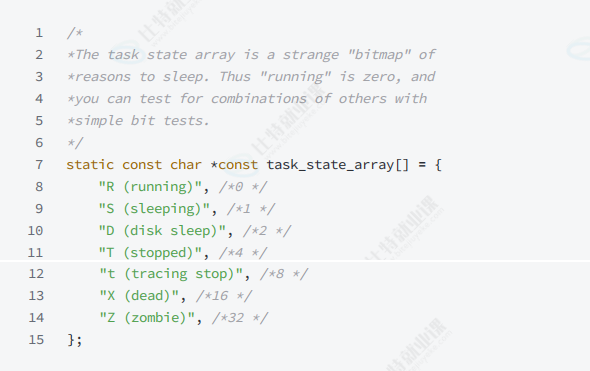 接下去我们又介绍了在Linux系统下的七种进程状态,分别是:运行状态R、浅度睡眠状态S、深度睡眠状态D、停止状态T、进程跟踪状态t、死亡状态X、僵死状态Z